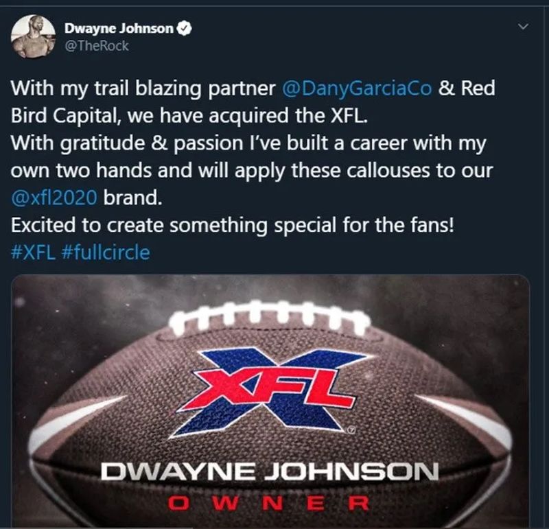 Johnson, luchador con presentaciones esporádicas en WWE y actor de la pantalla grande y televisión, se hizo de la XFL, la liga de futbol americano que fundó hace algunos años Vince McMahon, dueño de la WWE.
