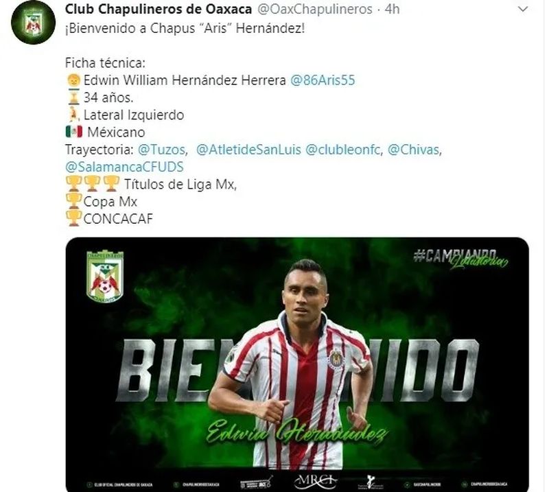 Este jueves el equipo oaxaqueño hizo oficial la llegada del defensor Edwin Hernández proveniente del Salamanca de España. Hernández dejó a Chivas hace un par de torneos para probar suerte con el equipo español, pero luego de poco tiempo ha regresado al futbol mexicano para continuar su carrera en una liga diferente que la dirige un excompañero como Carlos Salcido.