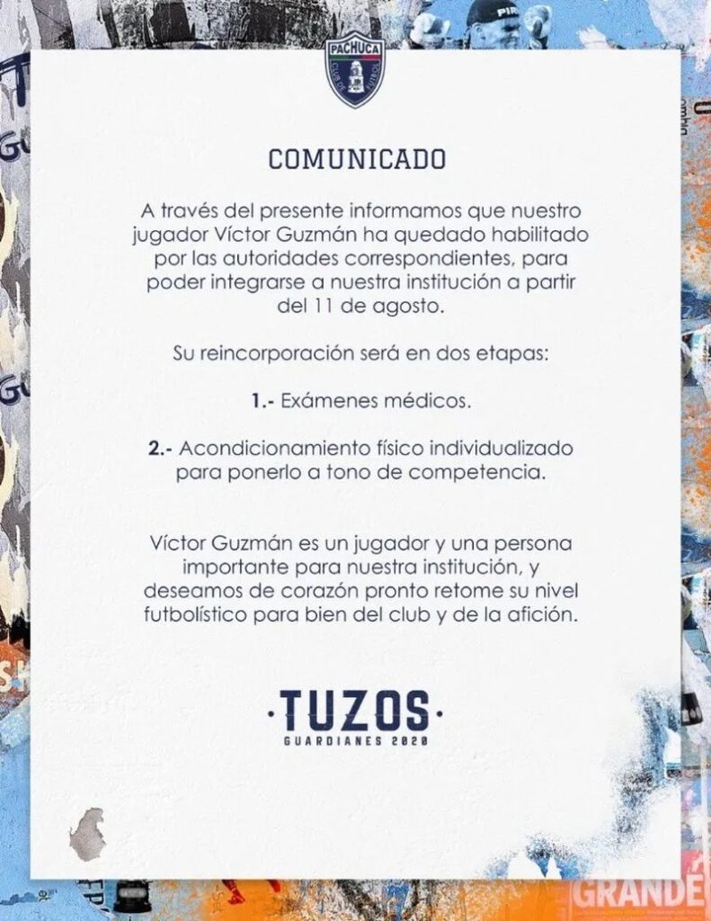 Club Pachuca dio a conocer que el jugador Víctor Guzmán ha sido absuelto de sus cargos y se ha habilitado para que se incorpore al equipo desde este martes para que sea parte del plantel del Guard1anes 2020.