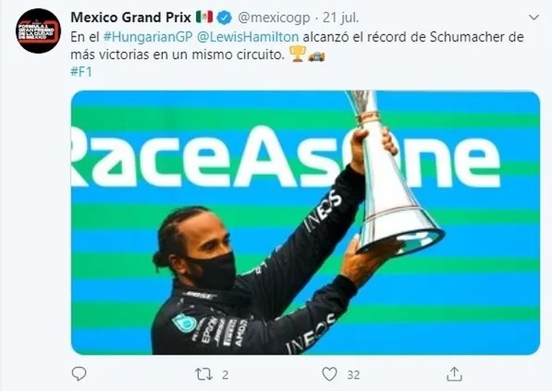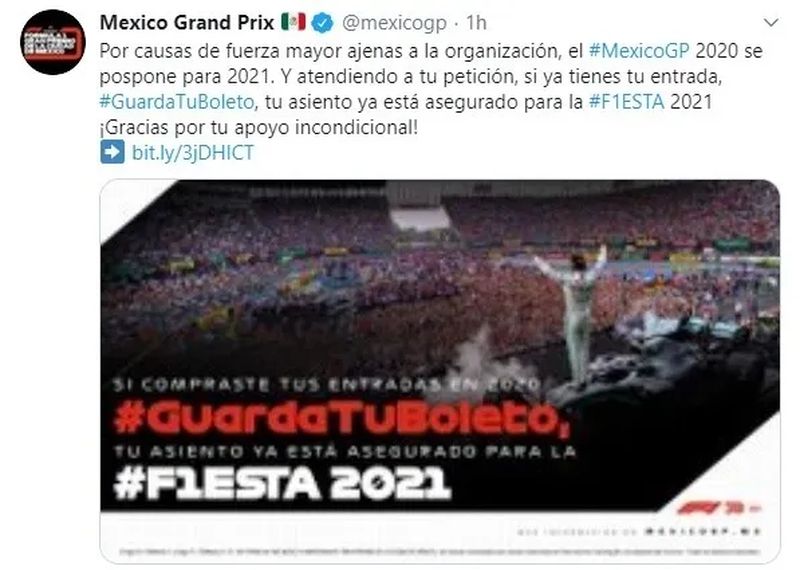 “Por causas de fuerza mayor ajenas a la organización, el #MexicoGP 2020 se pospone para 2021. Y atendiendo a tu petición, si ya tienes tu entrada, #GuardaTuBoleto, tu asiento ya está asegurado para la #F1ESTA 2021 ¡Gracias por tu apoyo incondicional!”