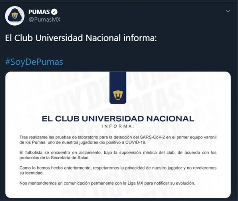 “Tras realizarse las pruebas de laboratorio para la detección del SARS-CoV-2 en primer equipo varonil de los Pumas, uno de nuestros jugadores dio positivo a Covid-19.