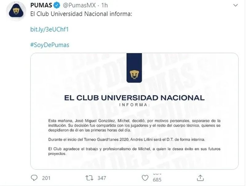 La directiva universitaria a confirmado la salida de Míchel González de la dirección técnica de Pumas y en su lugar quedará Andrés Lillini quien estará como entrenador interino en el tiempo que se encuentre al siguiente entrenador del equipo que se haga responsable del resto de la temporada. Por ahora el juego del debut este domingo estará bajo el mando de Lillini.