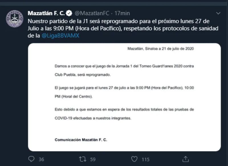 “Nuestro partido de la J1 será reprogramado para el próximo lunes 27 de Julio a las 9:00 PM (Hora del Pacífico), respetando los protocolos de sanidad de la @LigaBBVAMX” publicó el equipo de Mazatlán FC en su cuenta de Twitter.