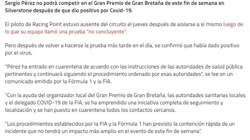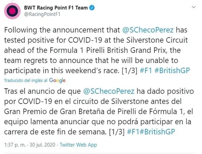 “Tras el anuncio de que Sergio ha dado positivo al COVID-19 en el circuito de Silverstone, antes del Gran Premio de Gran Bretaña, el equipo lamenta tener que comunicar que (Pérez) no podrá participar en la carrera de este fin de semana”, señaló el equipo en un comunicado.